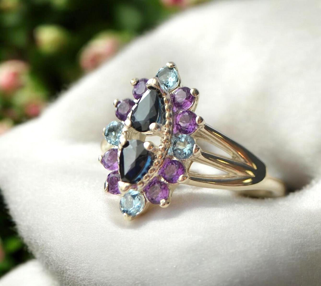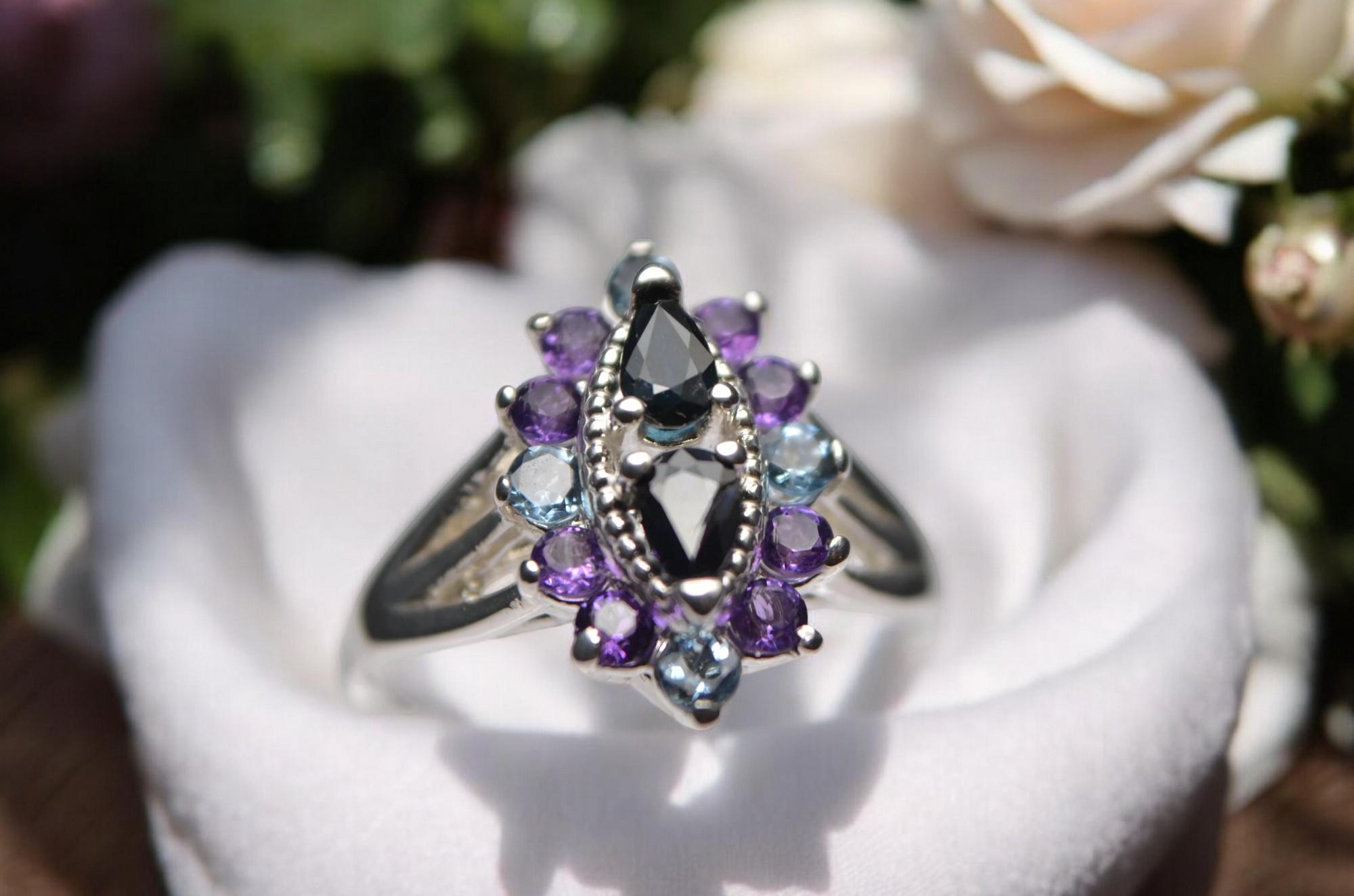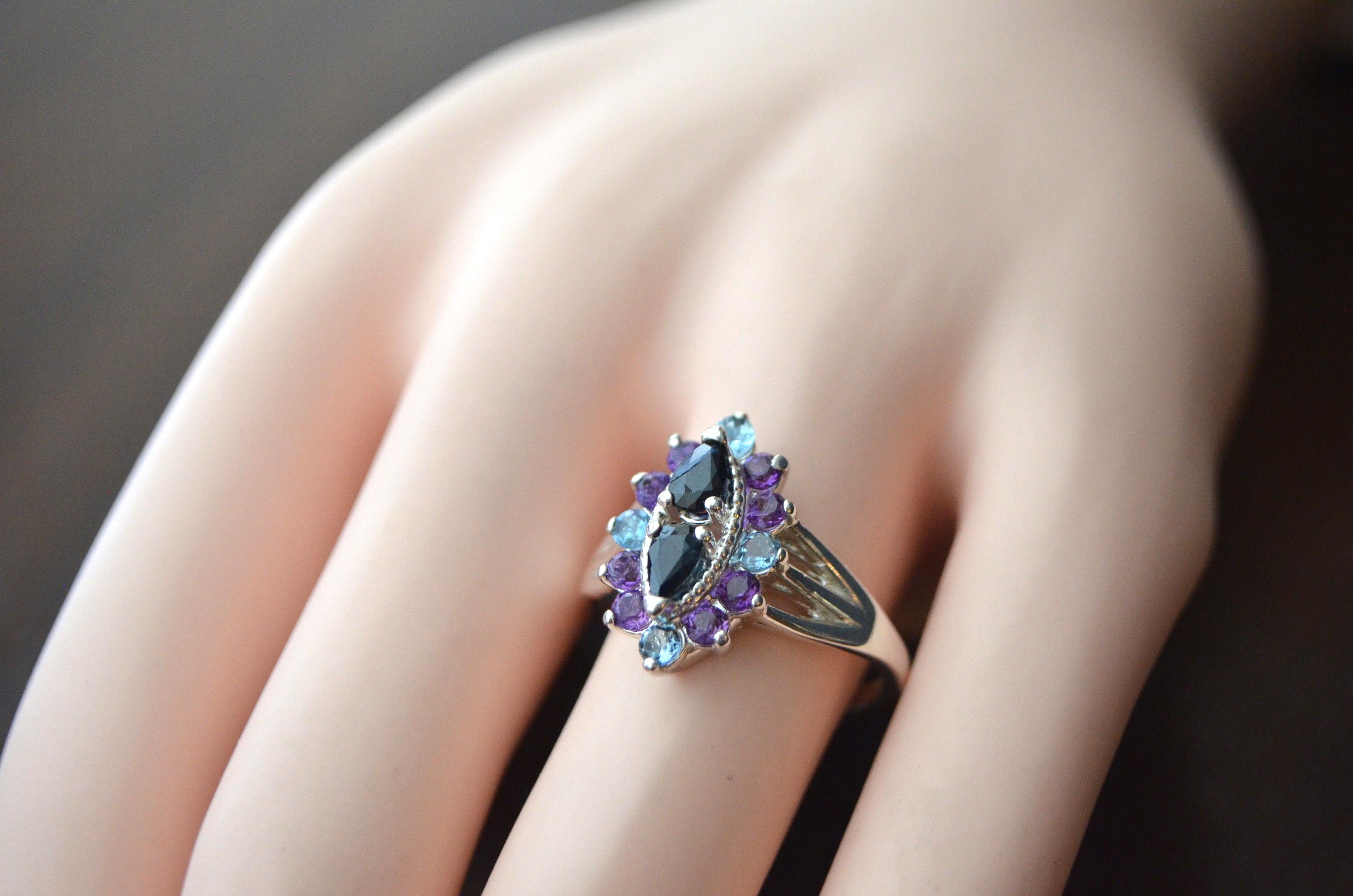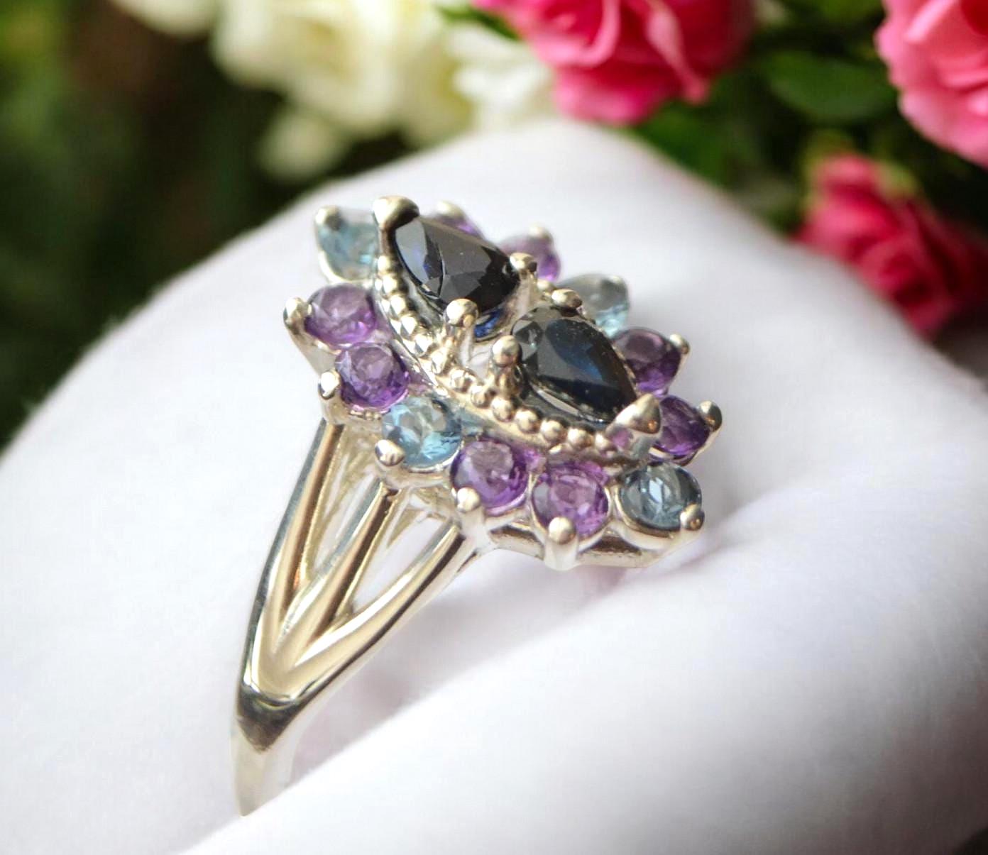 * Color: Blue Sapphires Center - Blue Aquamarine and Violet Amethyst accent stones.