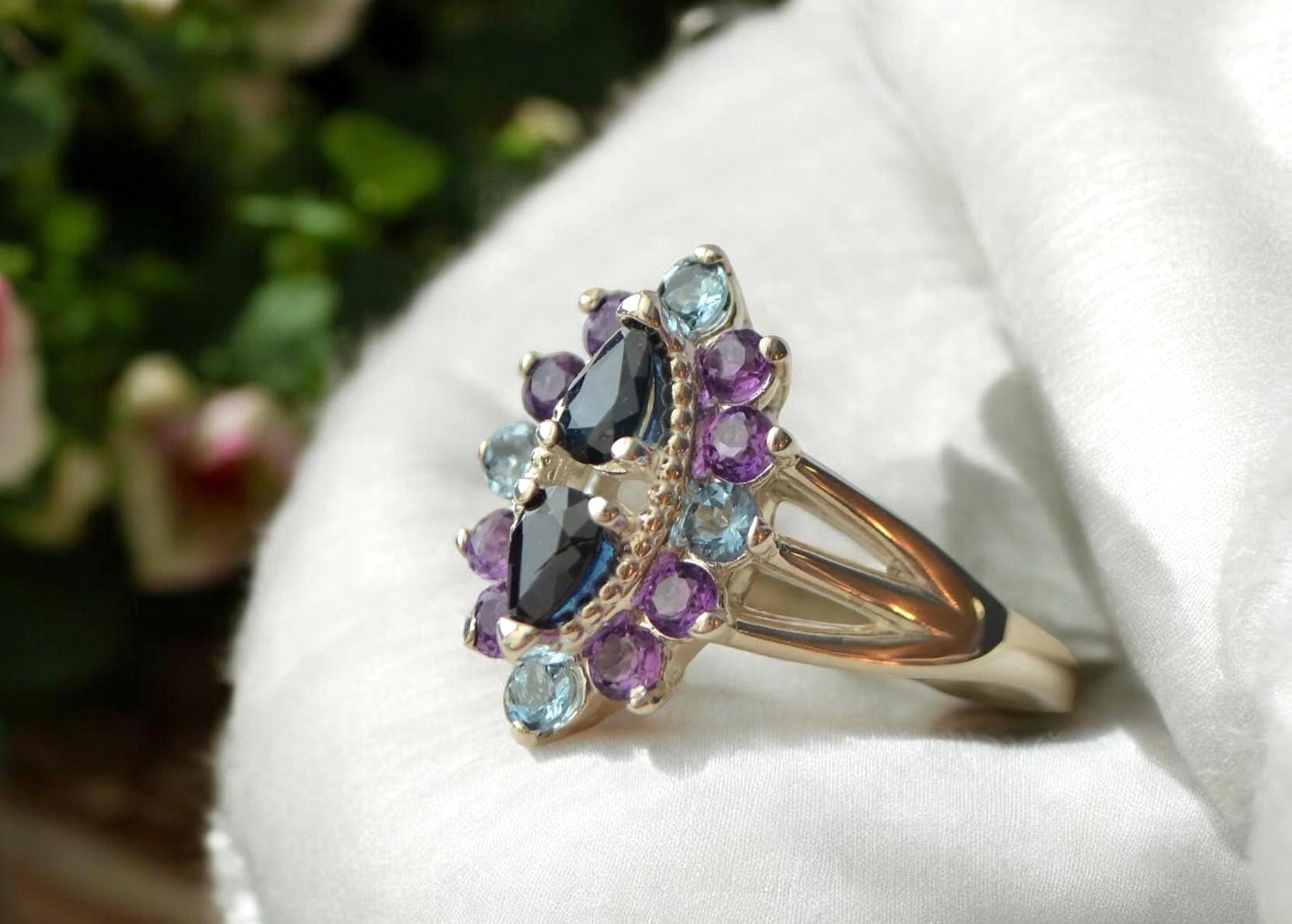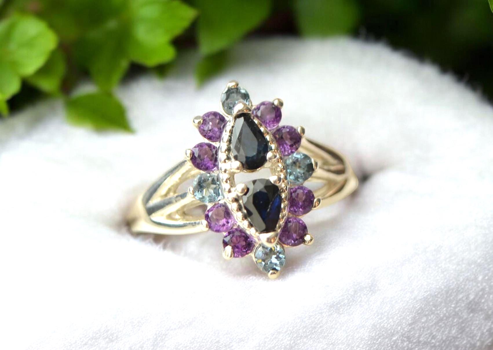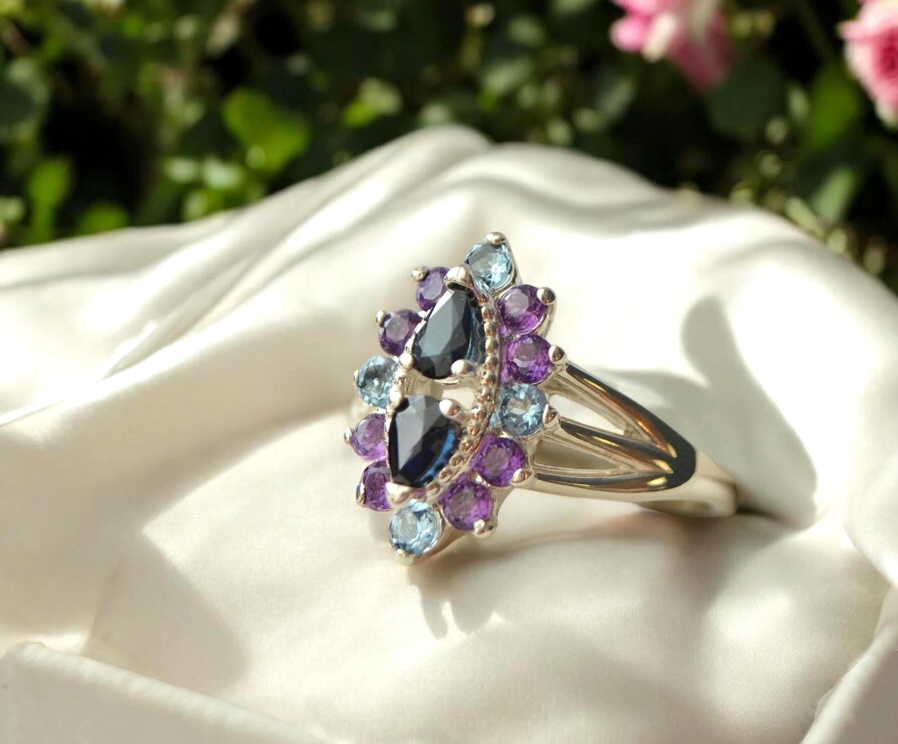 This beautifully crafted antique-inspired cluster ring brings vintage charm to life with a modern ethical twist. Featuring two genuine blue sapphire center stones in a striking double pear setting, this piece is a true statement of timeless beauty. Surrounding the sapphires are twelve sparkling 2.5 mm accent stones in a delicate mix of amethyst and aquamarine, creating a soft yet vibrant color palette that catches the light—and attention—from every angle.
