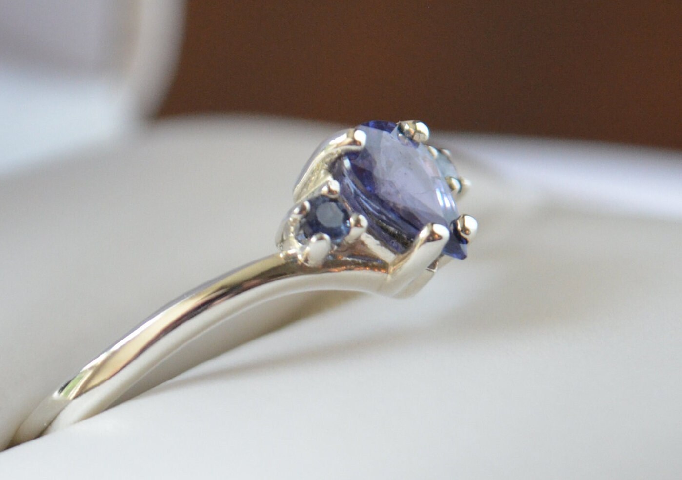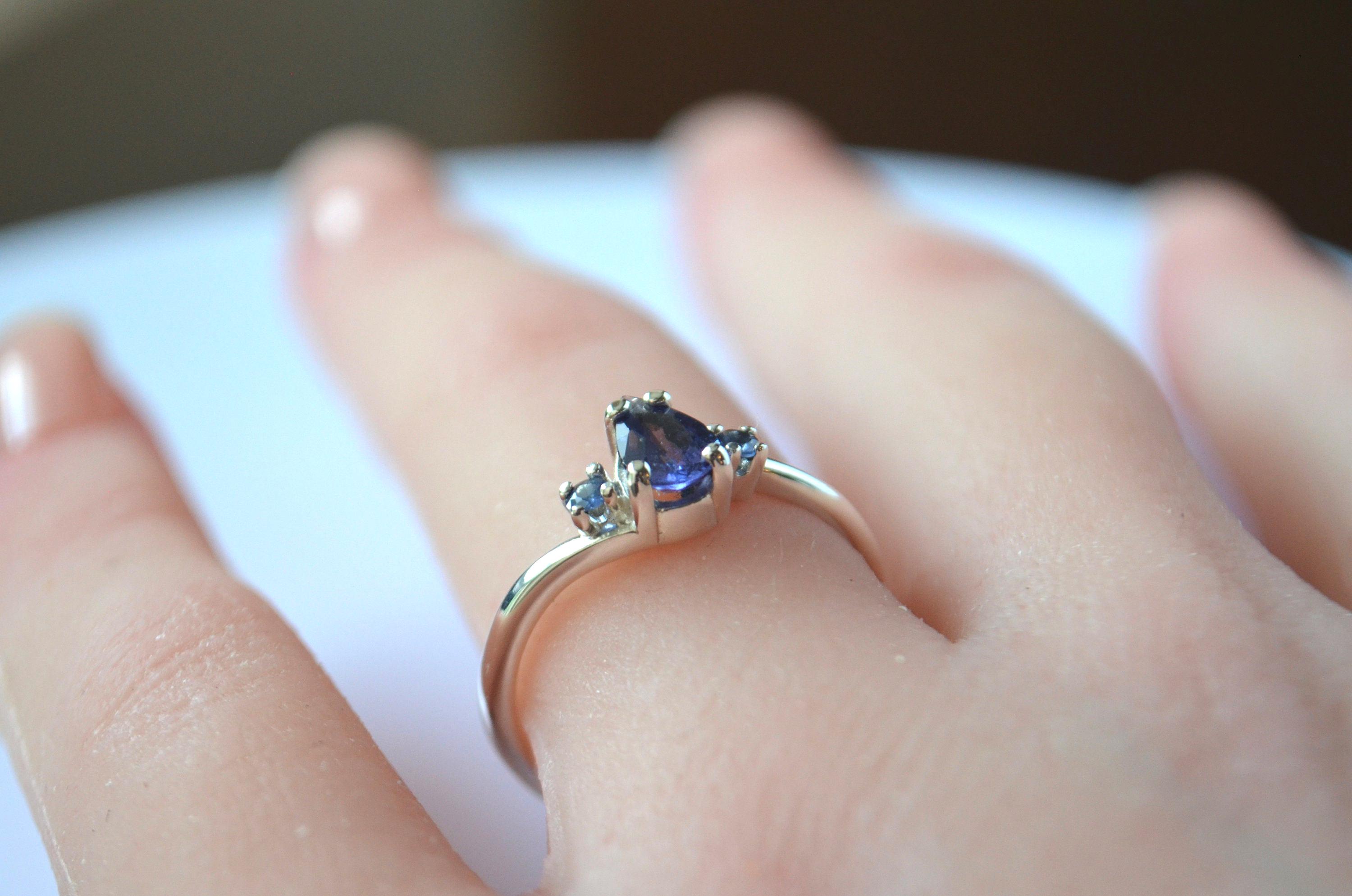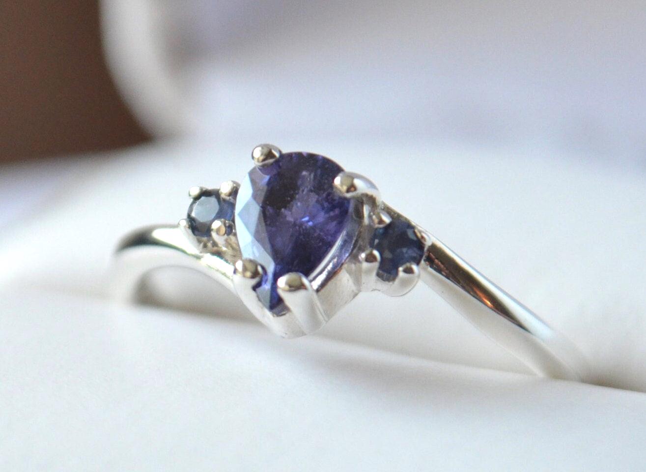 Flanked by two rich blue sapphire accent stones, the contrast enhances the purple center, adding depth and dimension to an already striking piece. The classic pear shape adds graceful movement and timeless femininity, making this ring as unique as the person who wears it.