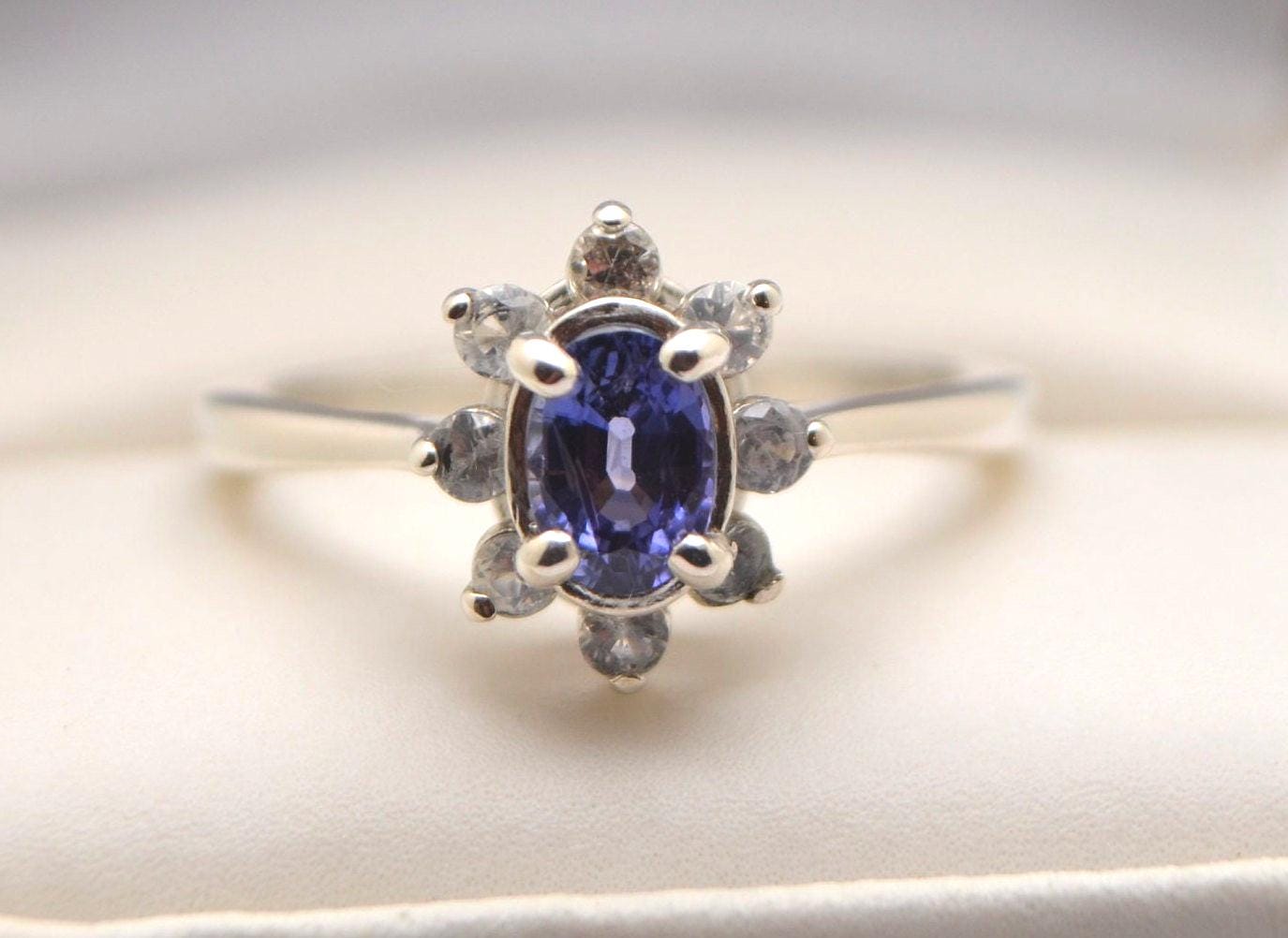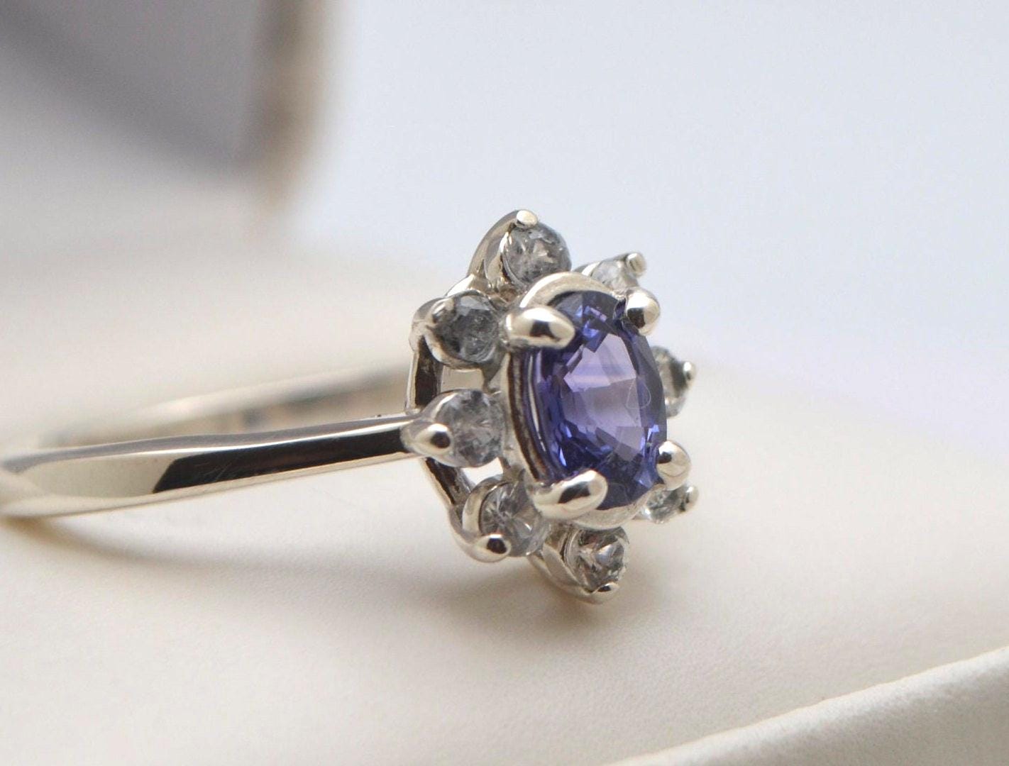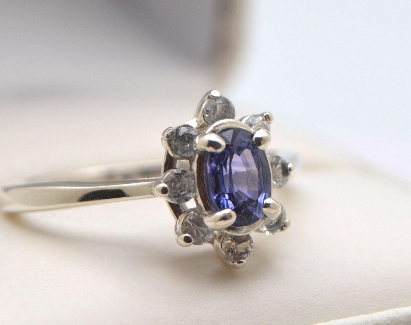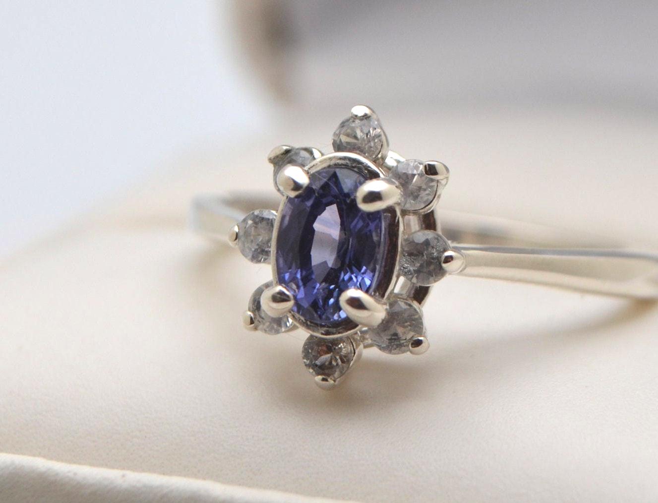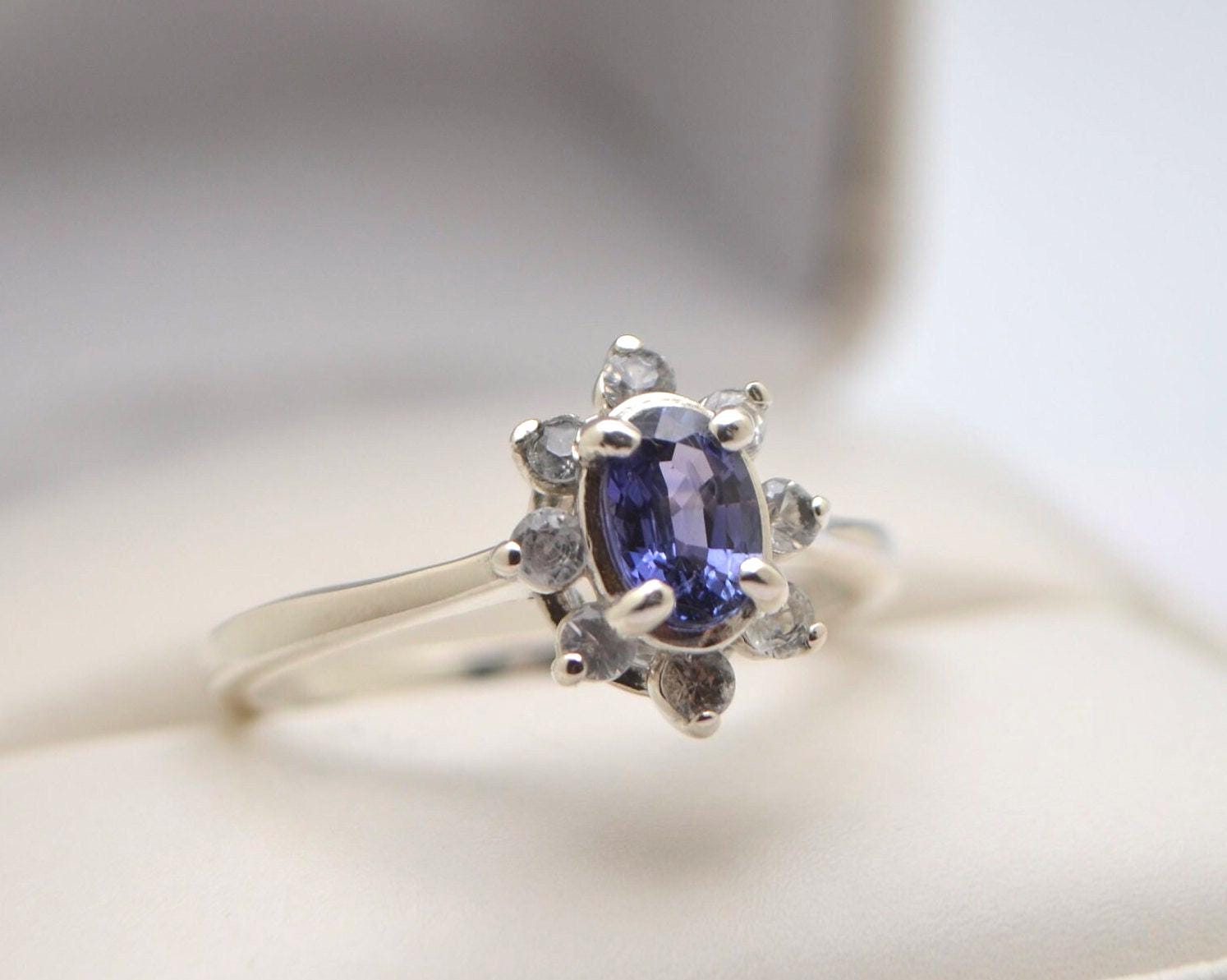 Surrounding the centerpiece are eight sparkling 2mm white sapphire accents, creating a celestial frame that enhances the sapphire's natural luster.