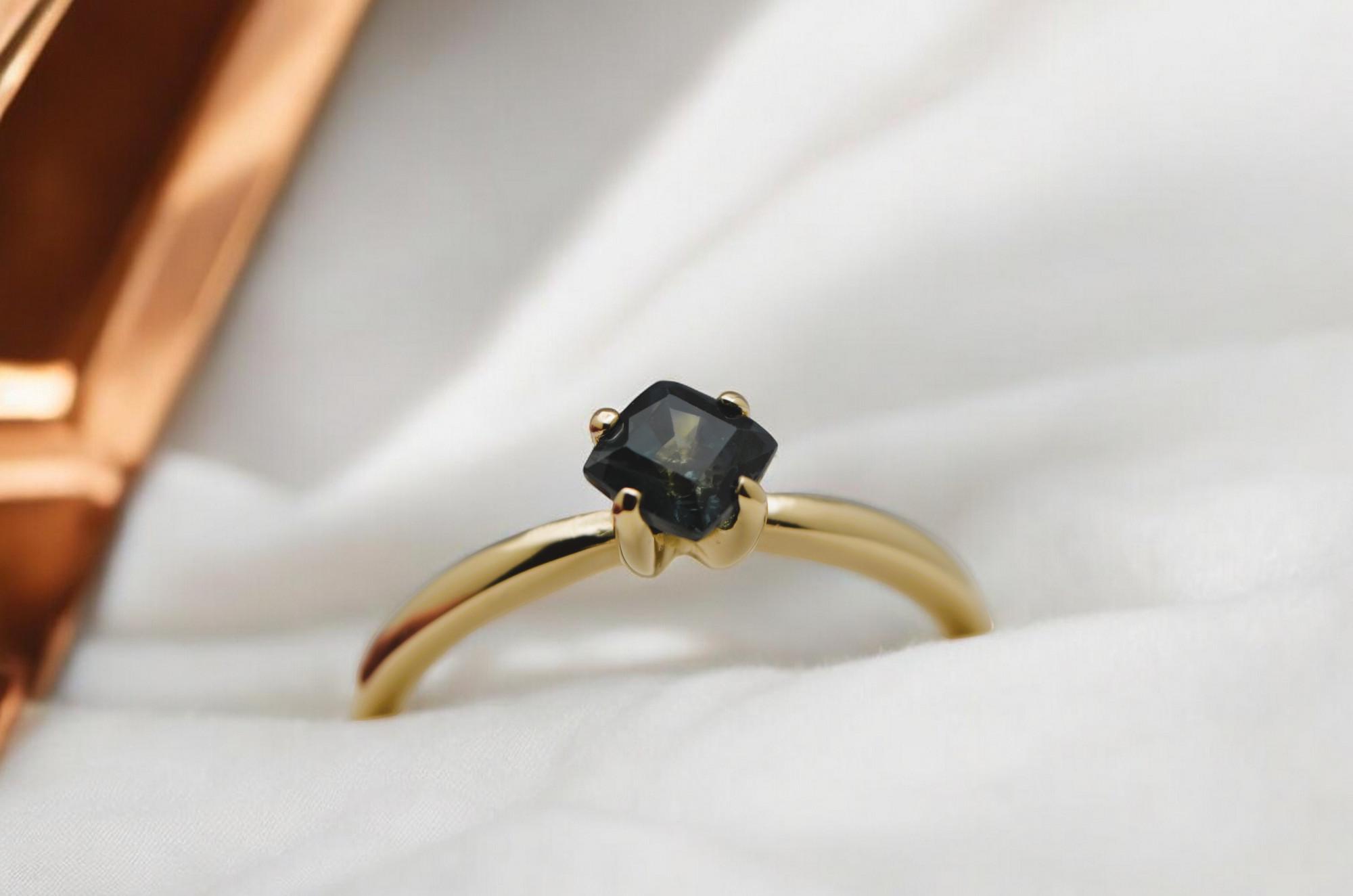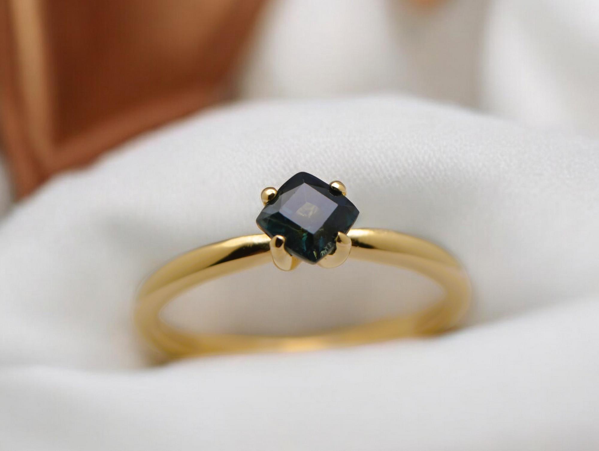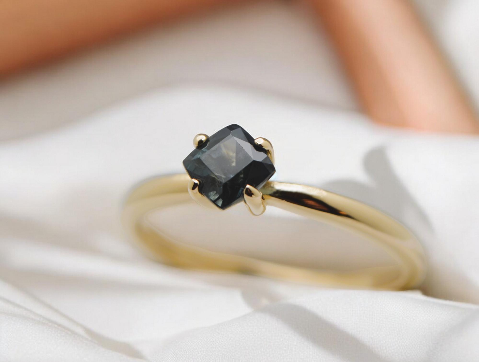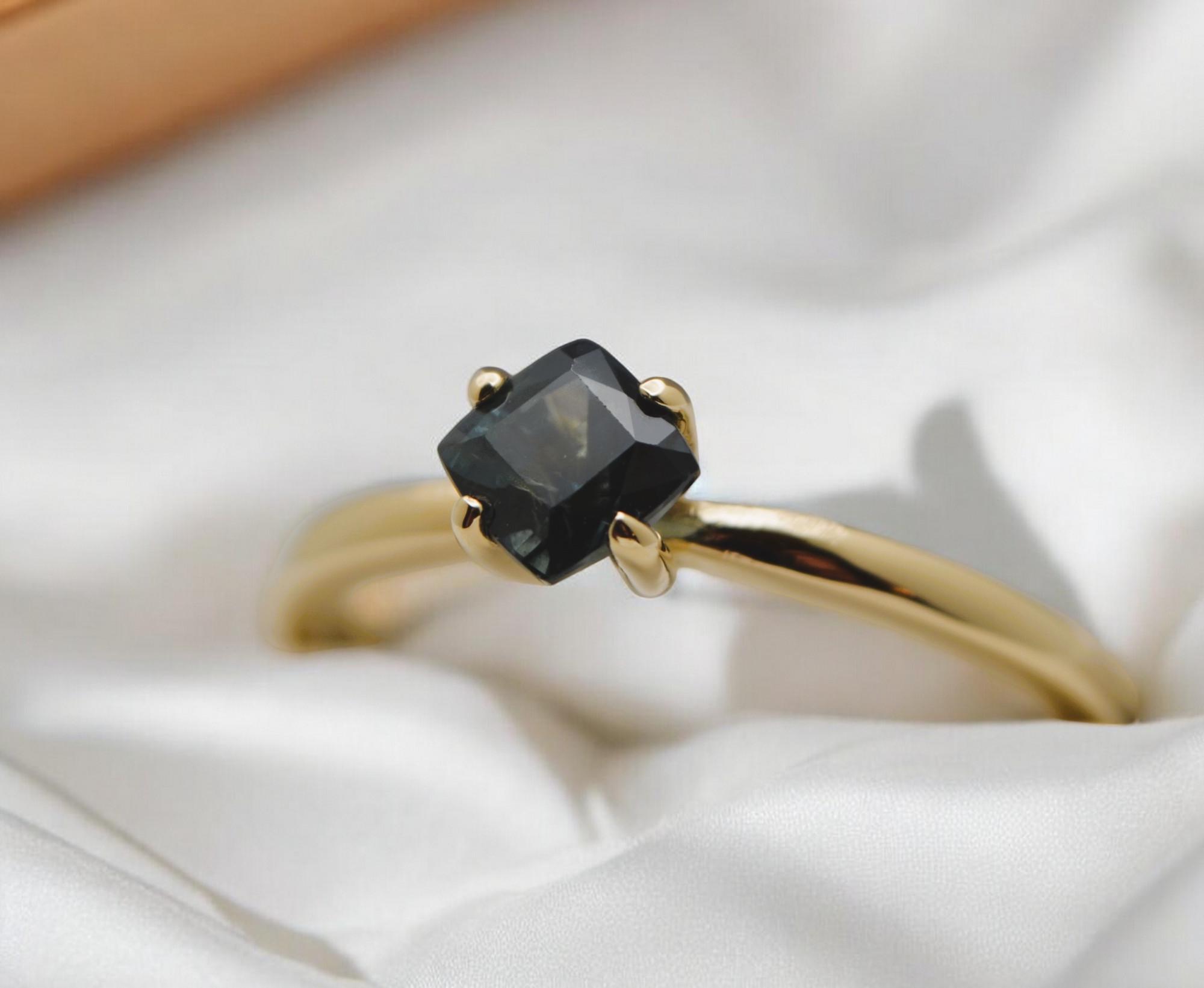 Make a bold, timeless statement with this cushion-cut navy blue sapphire, mined from the legendary gem fields of Madagascar. Set in rich 14K gold, its deep, velvety hue evokes depth, elegance, and quiet strength. This gemstone’s classic cut and natural origin create a piece that’s both refined and enduring—a perfect symbol of sophistication rooted in the earth.