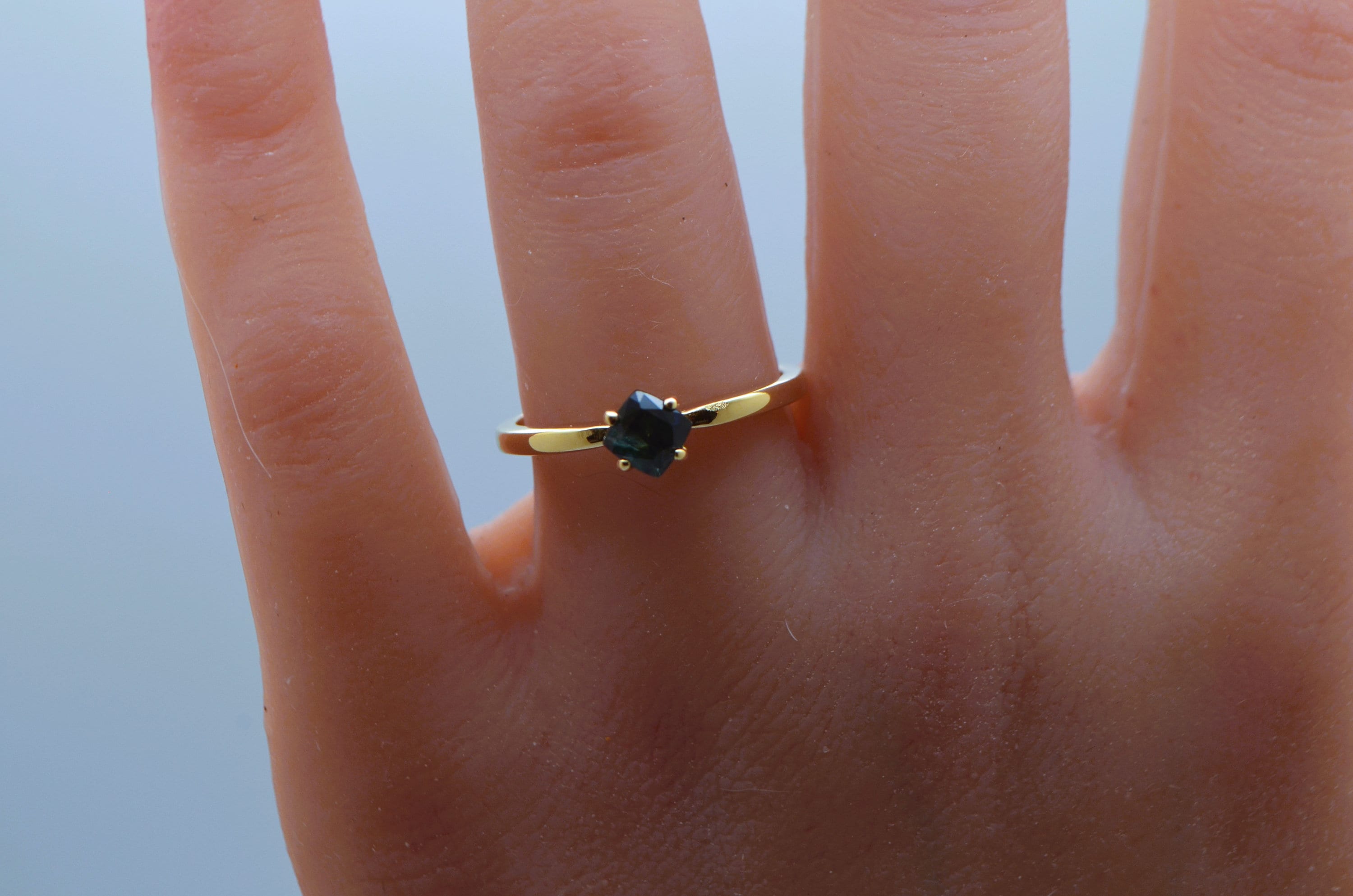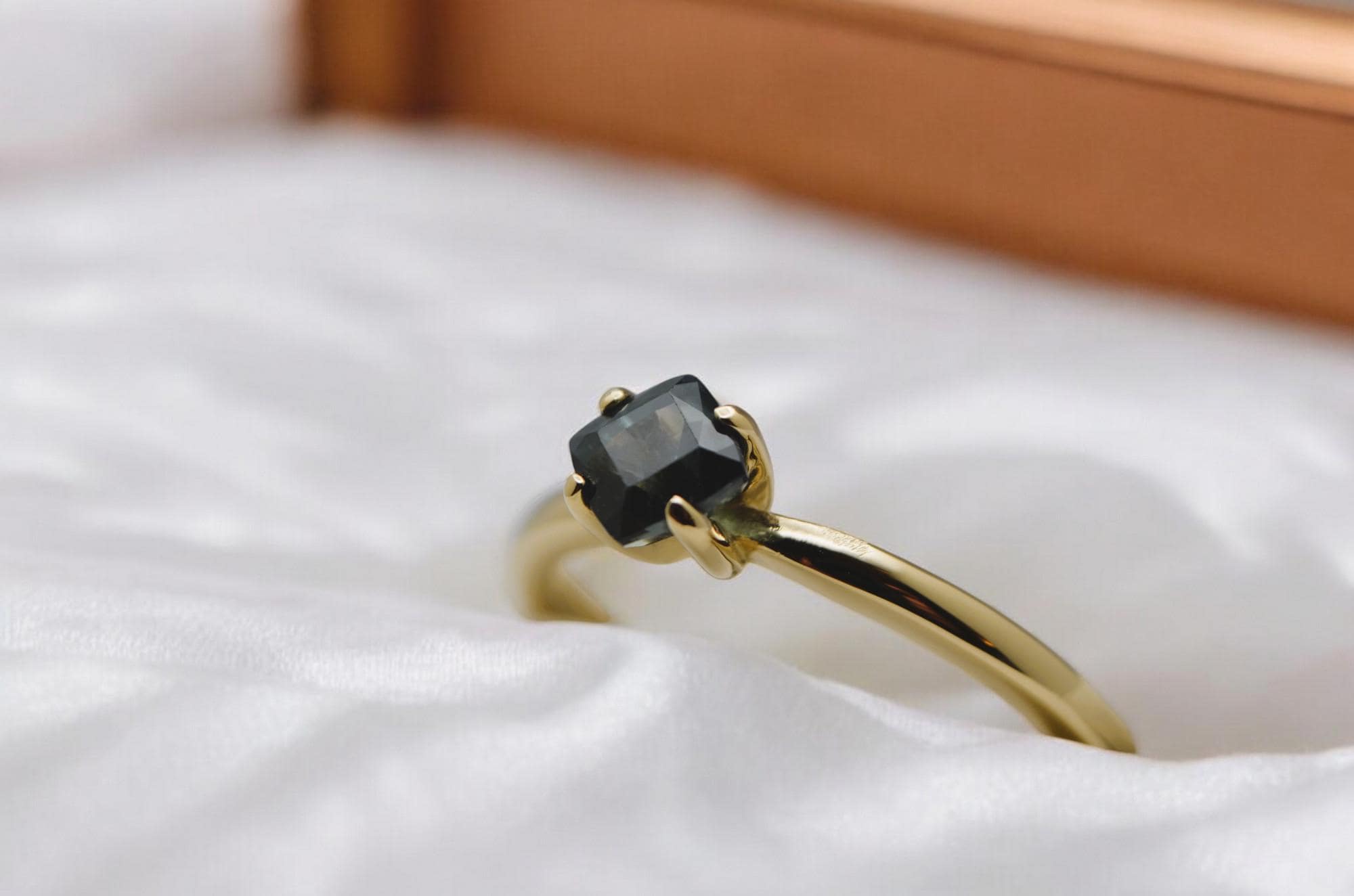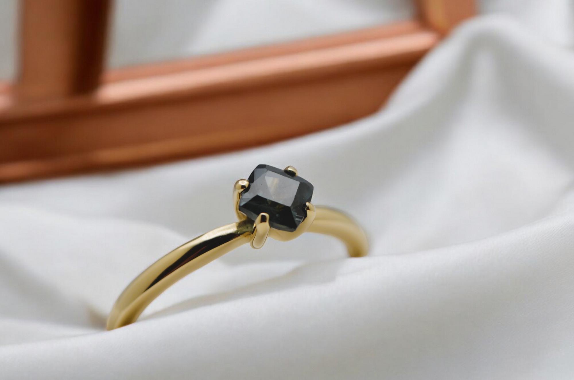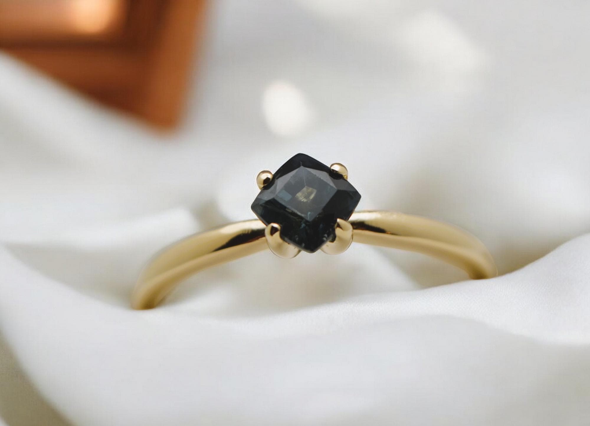 Make a bold, timeless statement with this cushion-cut navy blue sapphire, mined from the legendary gem fields of Madagascar. Set in rich 14K gold, its deep, velvety hue evokes depth, elegance, and quiet strength. This gemstone’s classic cut and natural origin create a piece that’s both refined and enduring—a perfect symbol of sophistication rooted in the earth.