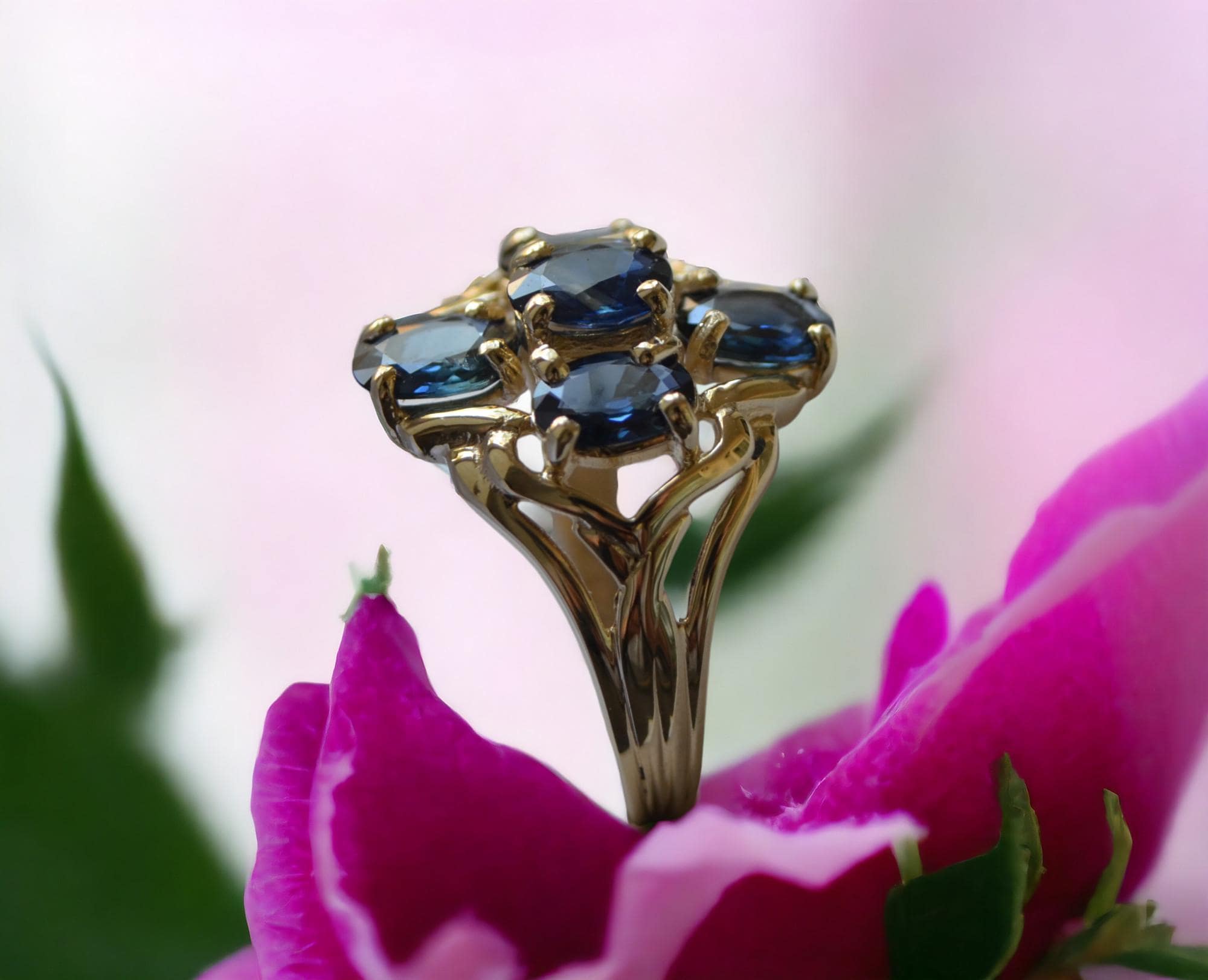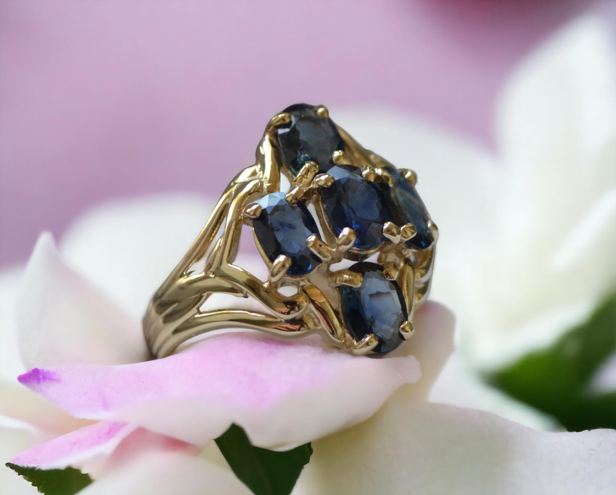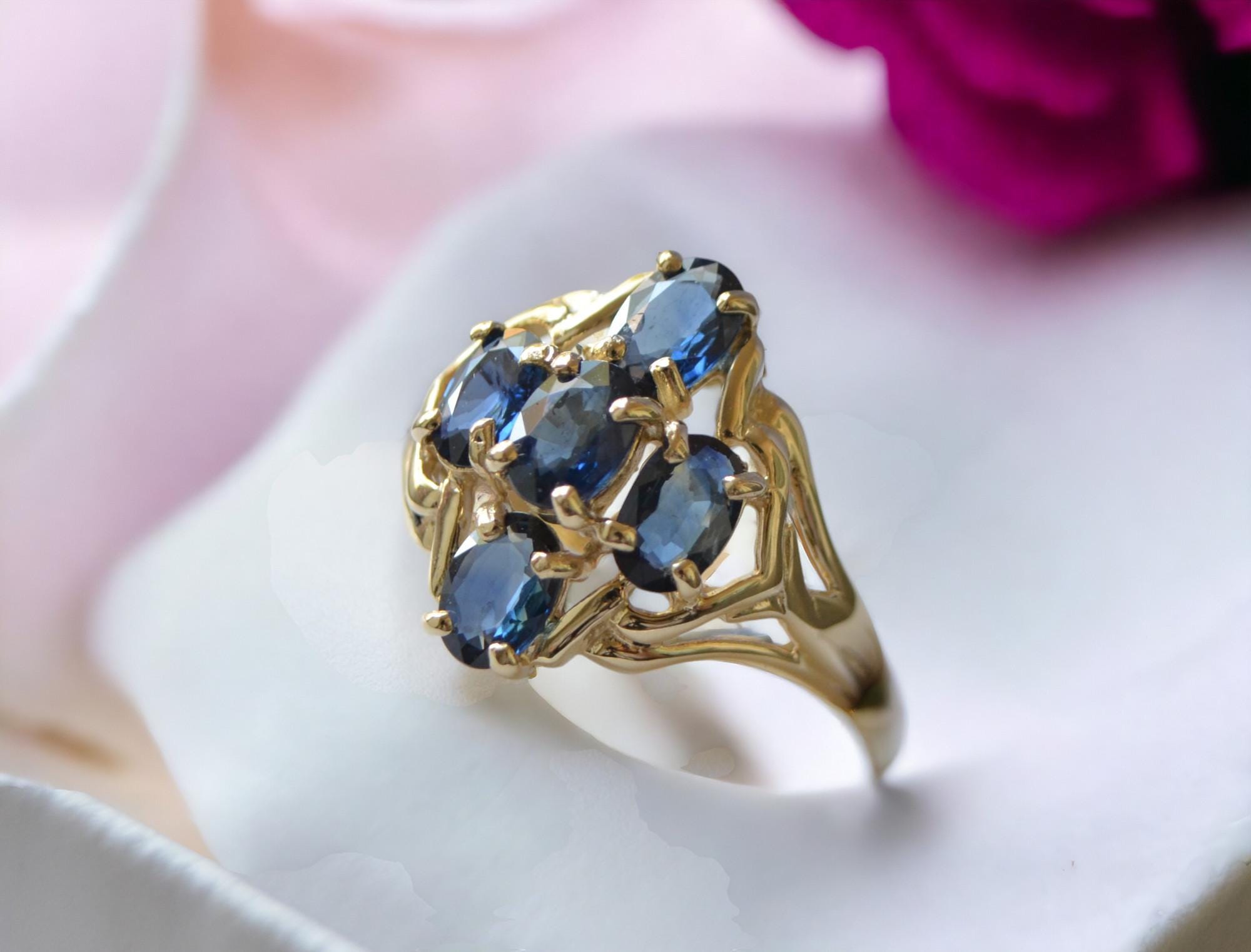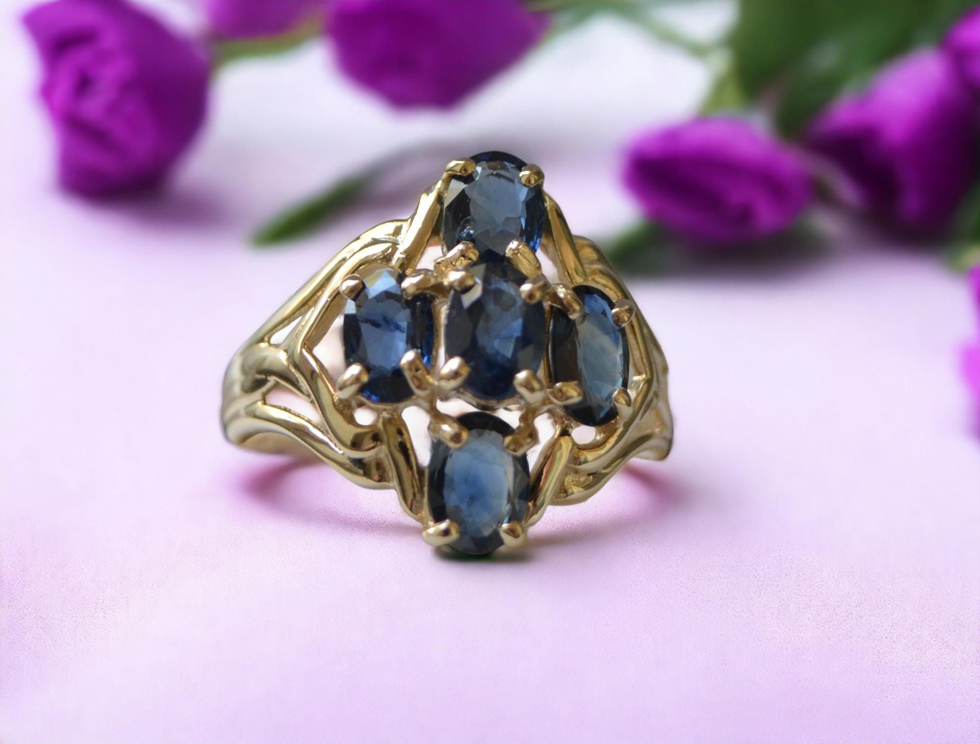 Elevate your style with this striking 5-stone blue sapphire cocktail ring, featuring 2.47 carats of genuine sapphires set in rich 14K solid gold. Ethically mined in Africa, each sapphire radiates a deep, oceanic blue—capturing both elegance and strength. Perfect for making a sophisticated statement, this ring is a bold blend of fine craftsmanship, ethical sourcing, and timeless beauty.