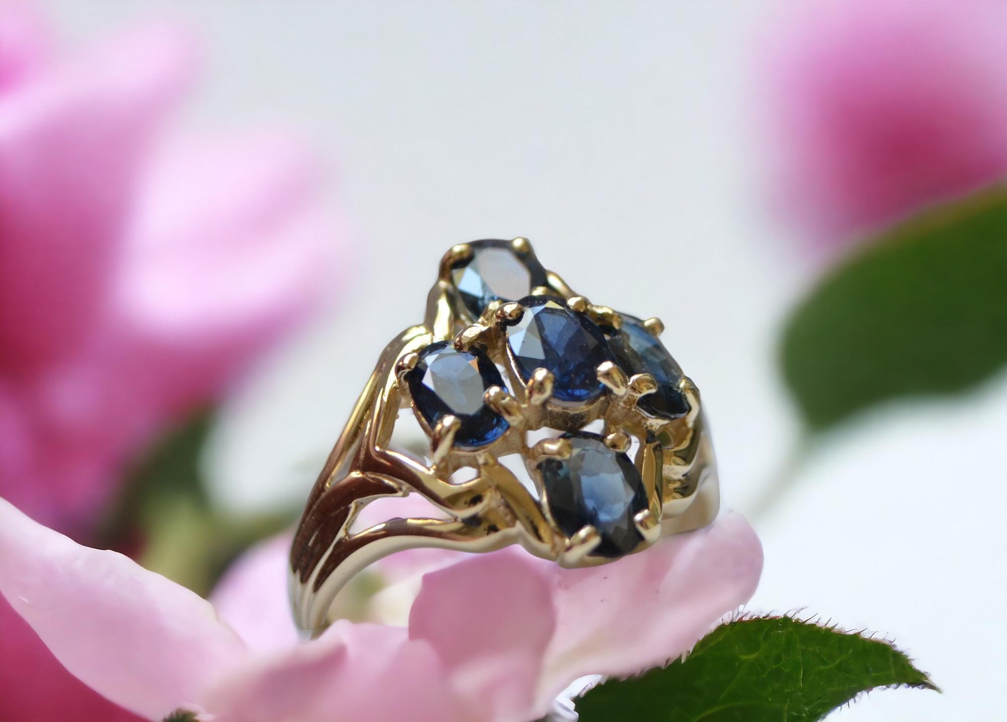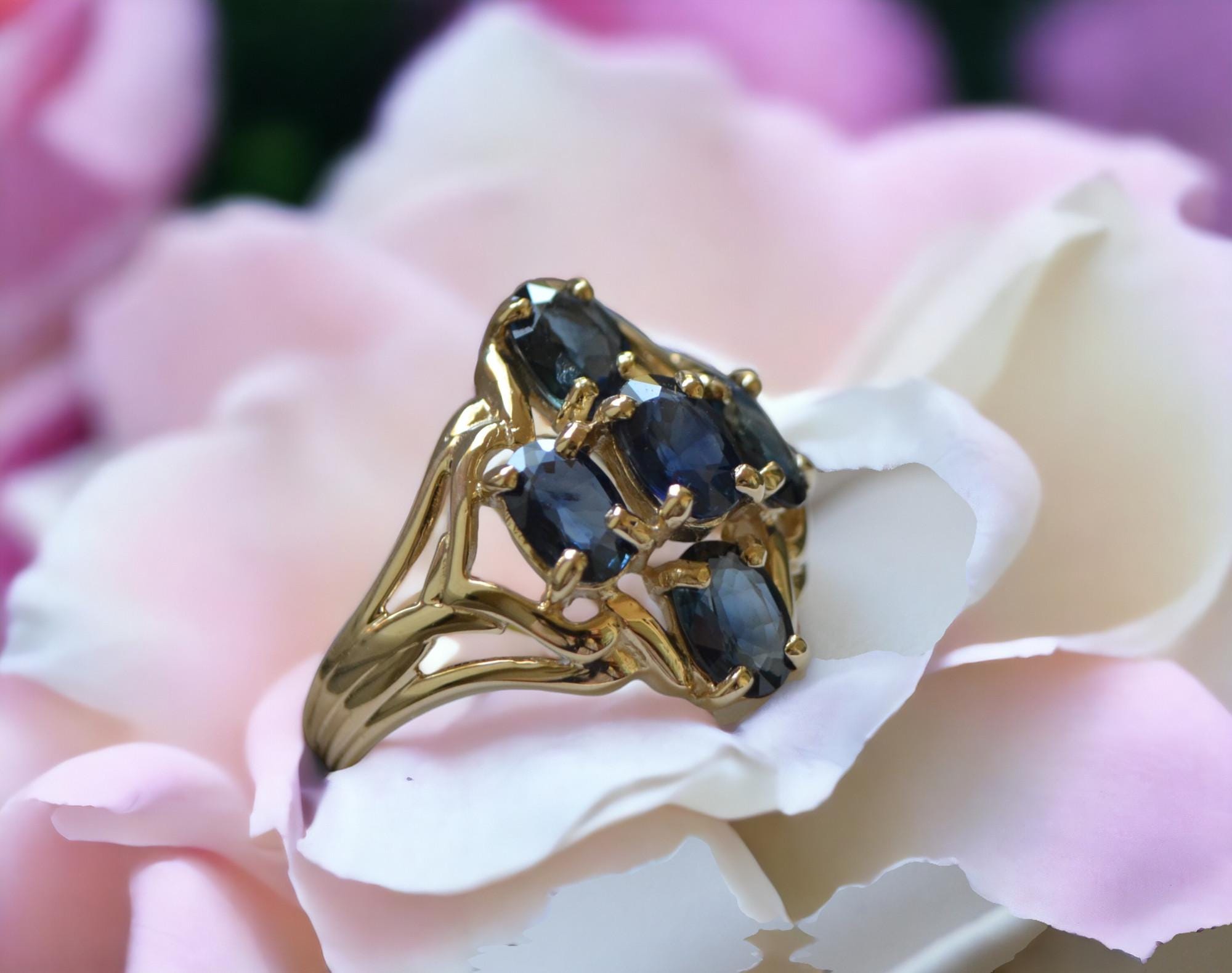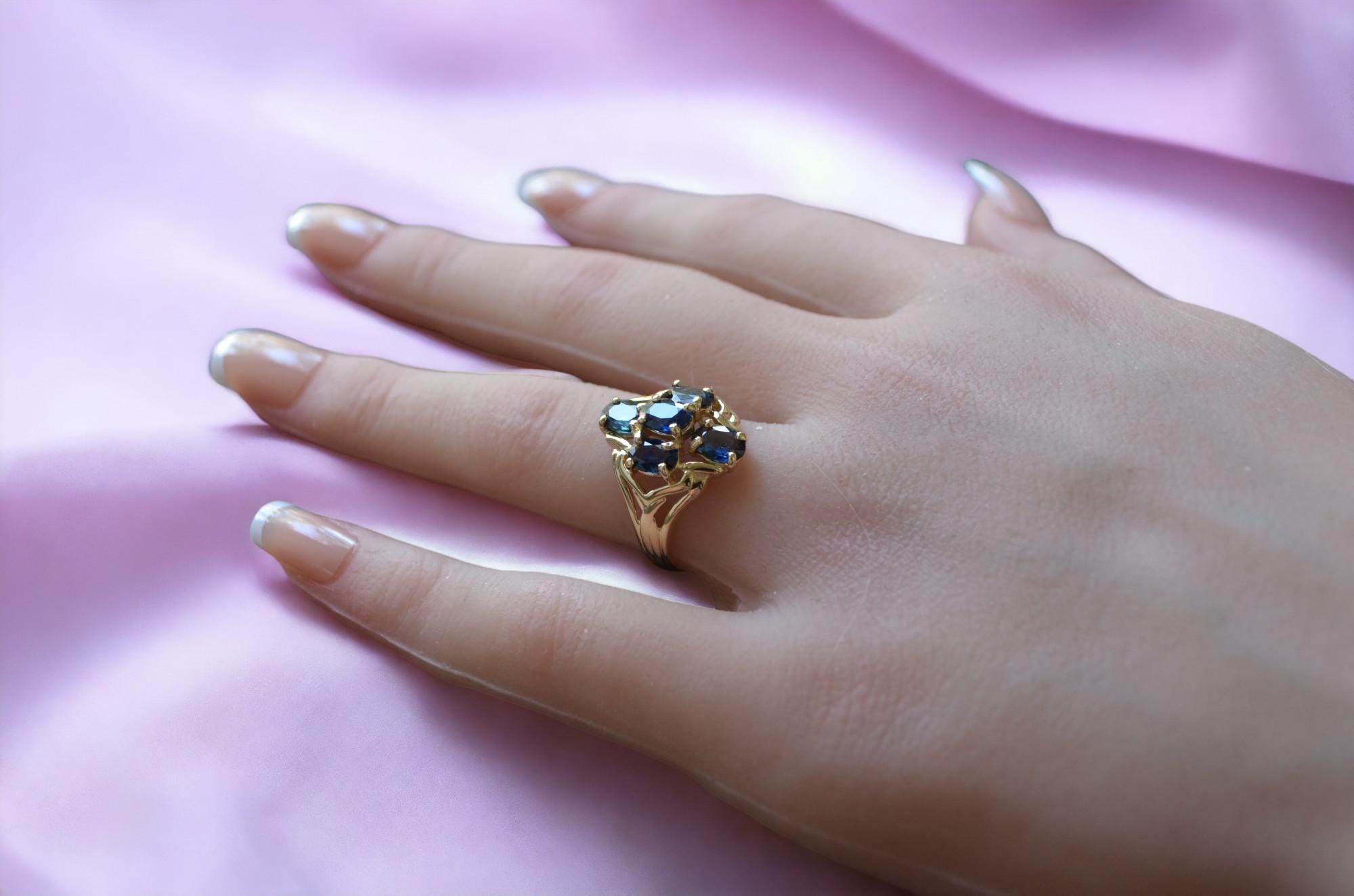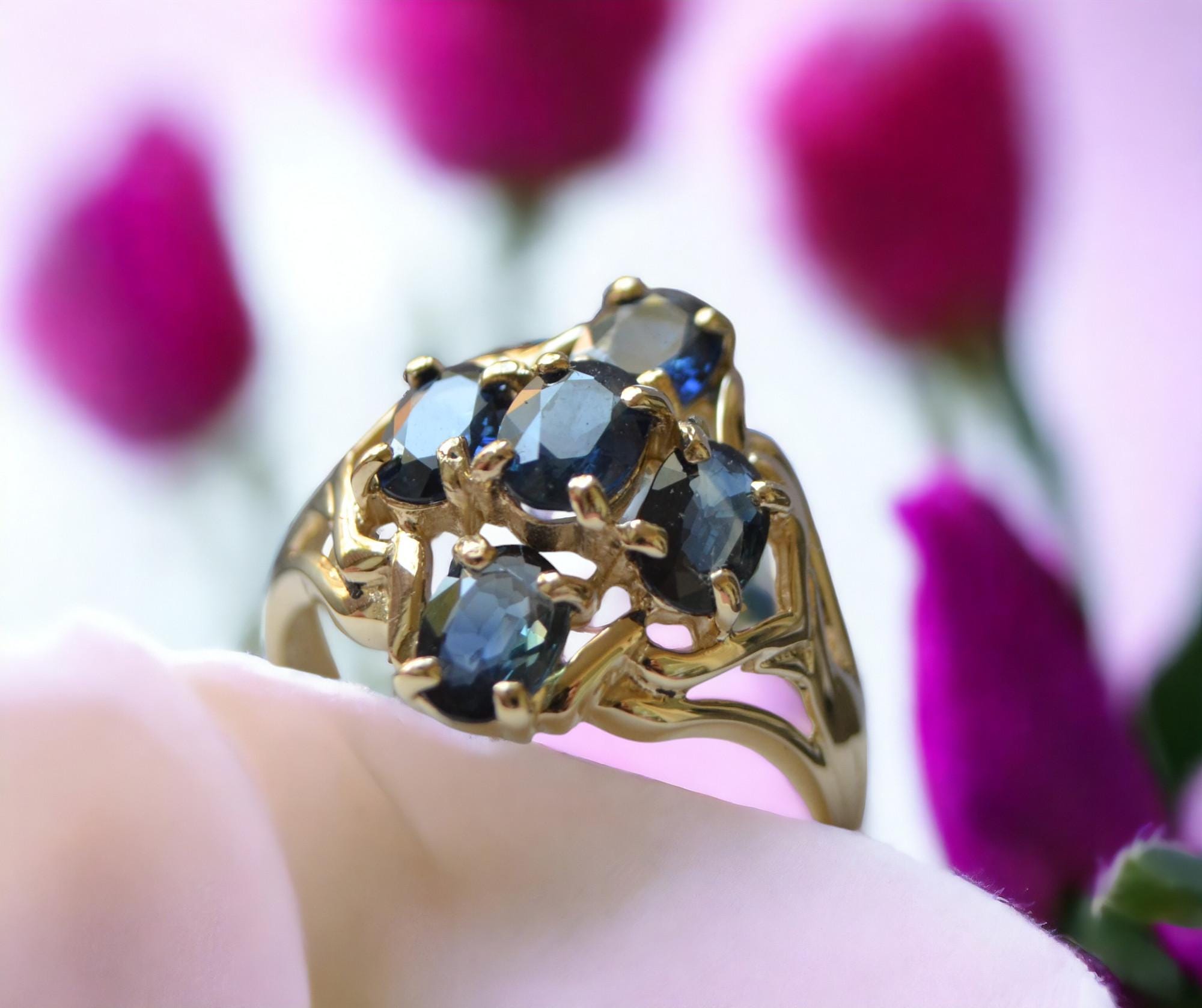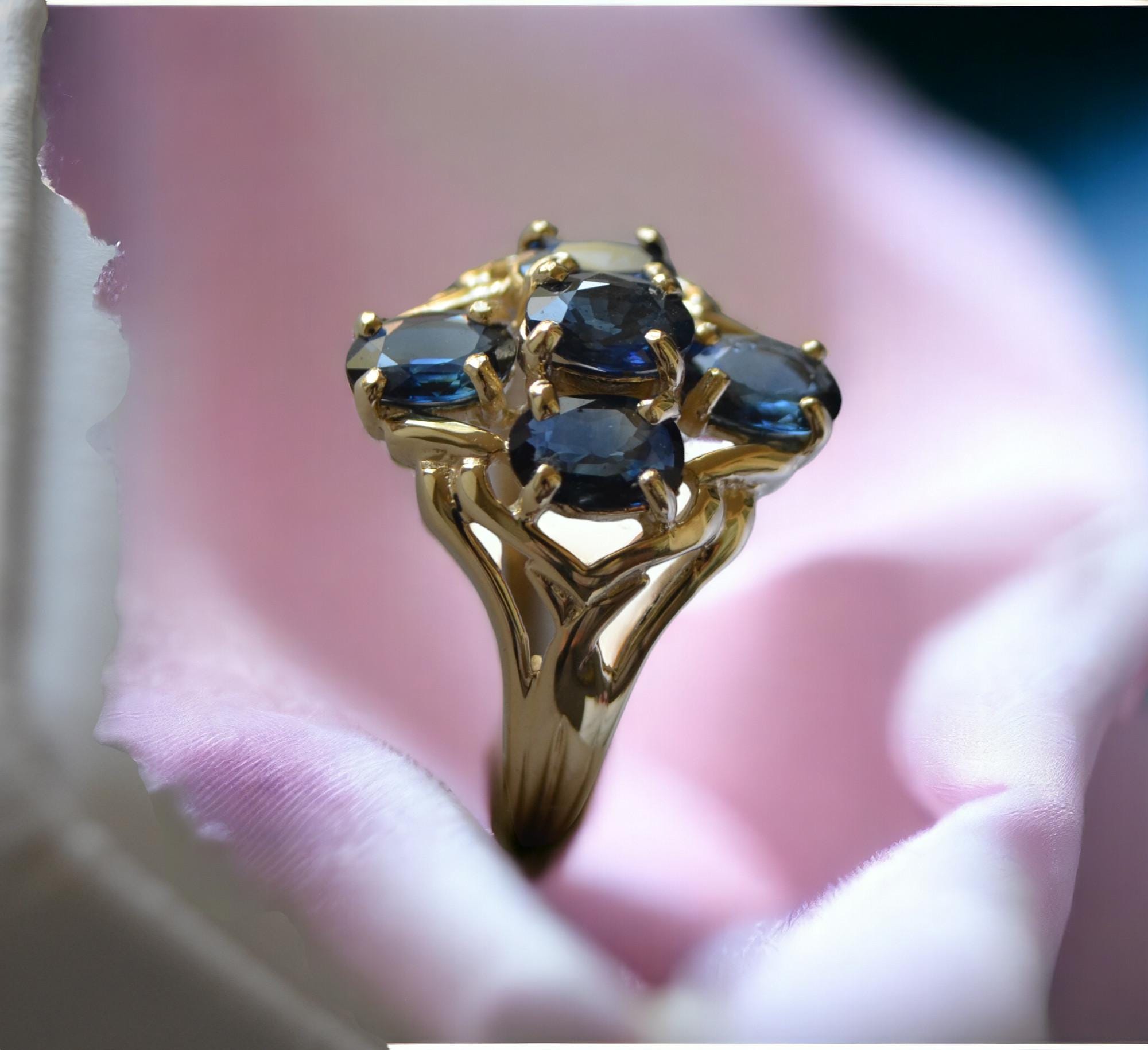 Elevate your style with this striking 5-stone blue sapphire cocktail ring, featuring 2.47 carats of genuine sapphires set in rich 14K solid gold. Ethically mined in Africa, each sapphire radiates a deep, oceanic blue—capturing both elegance and strength. Perfect for making a sophisticated statement, this ring is a bold blend of fine craftsmanship, ethical sourcing, and timeless beauty.