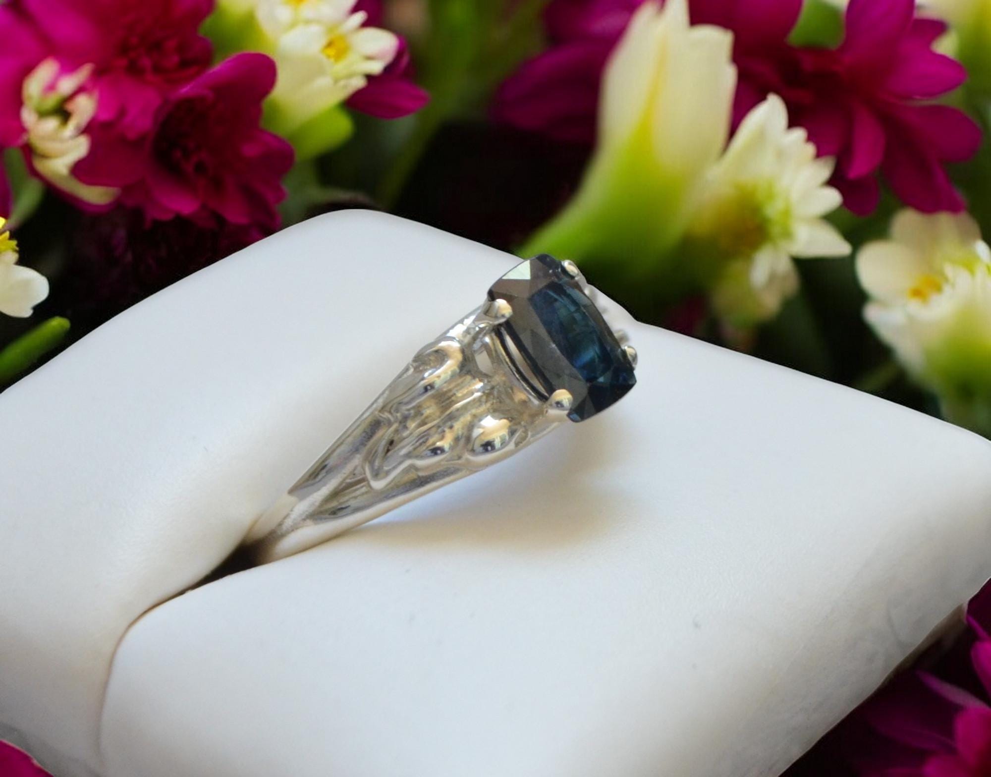 Experience the natural beauty of balance and brilliance with this 1.26 carat cushion-cut sapphire, glowing in an enchanting blue-green teal hue that shifts with the light—evoking the mystery of deep waters and untamed forests.