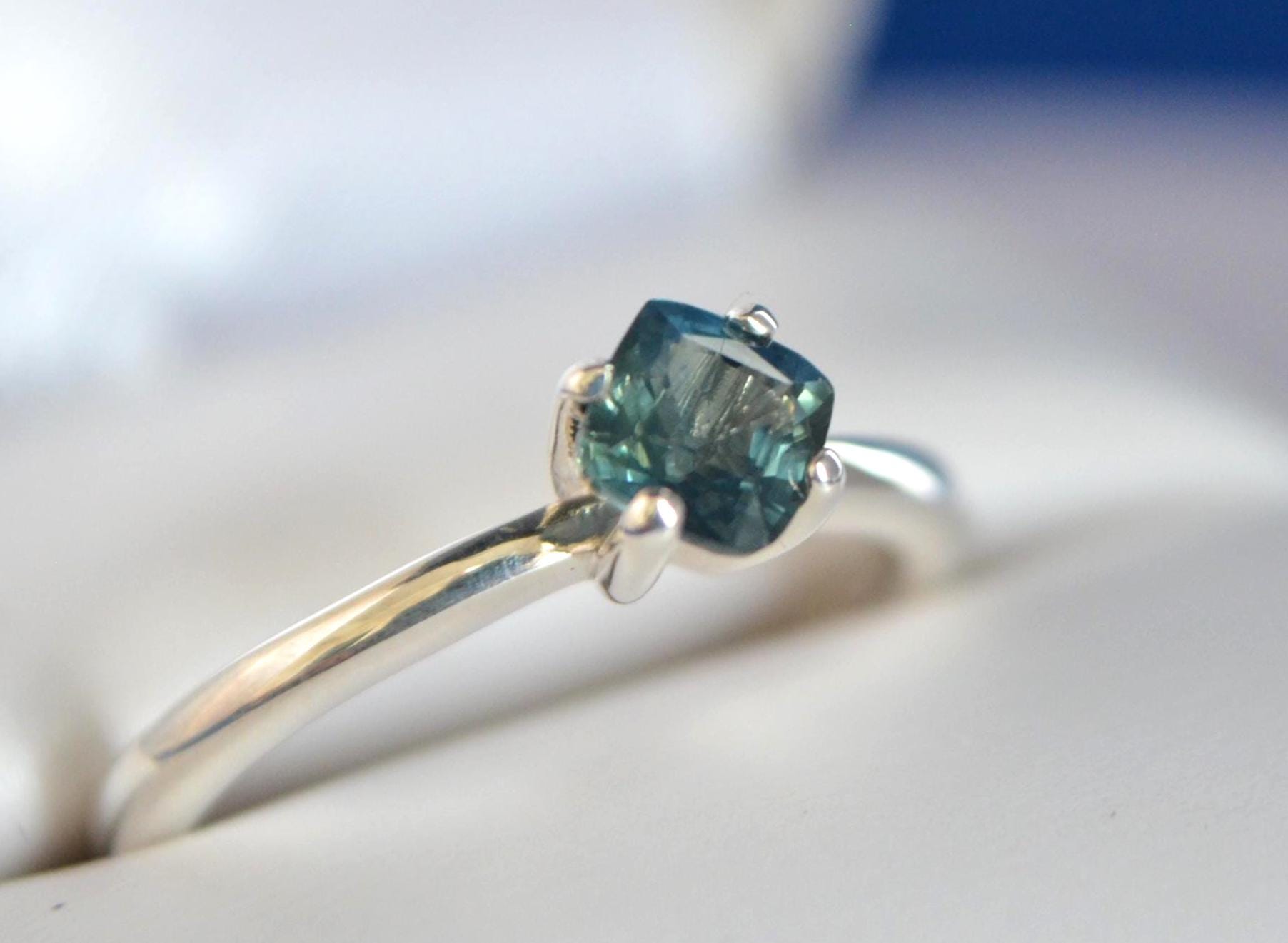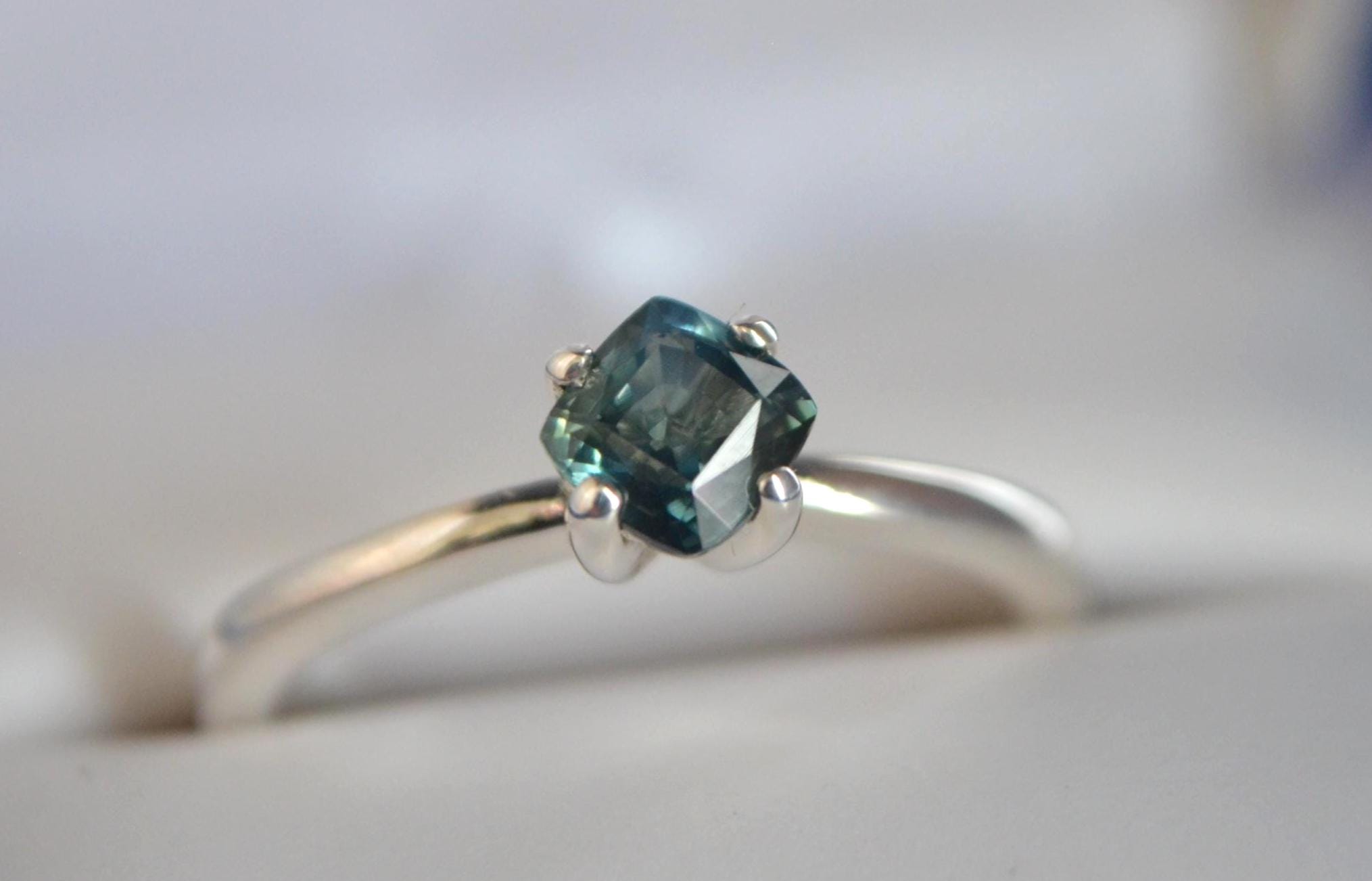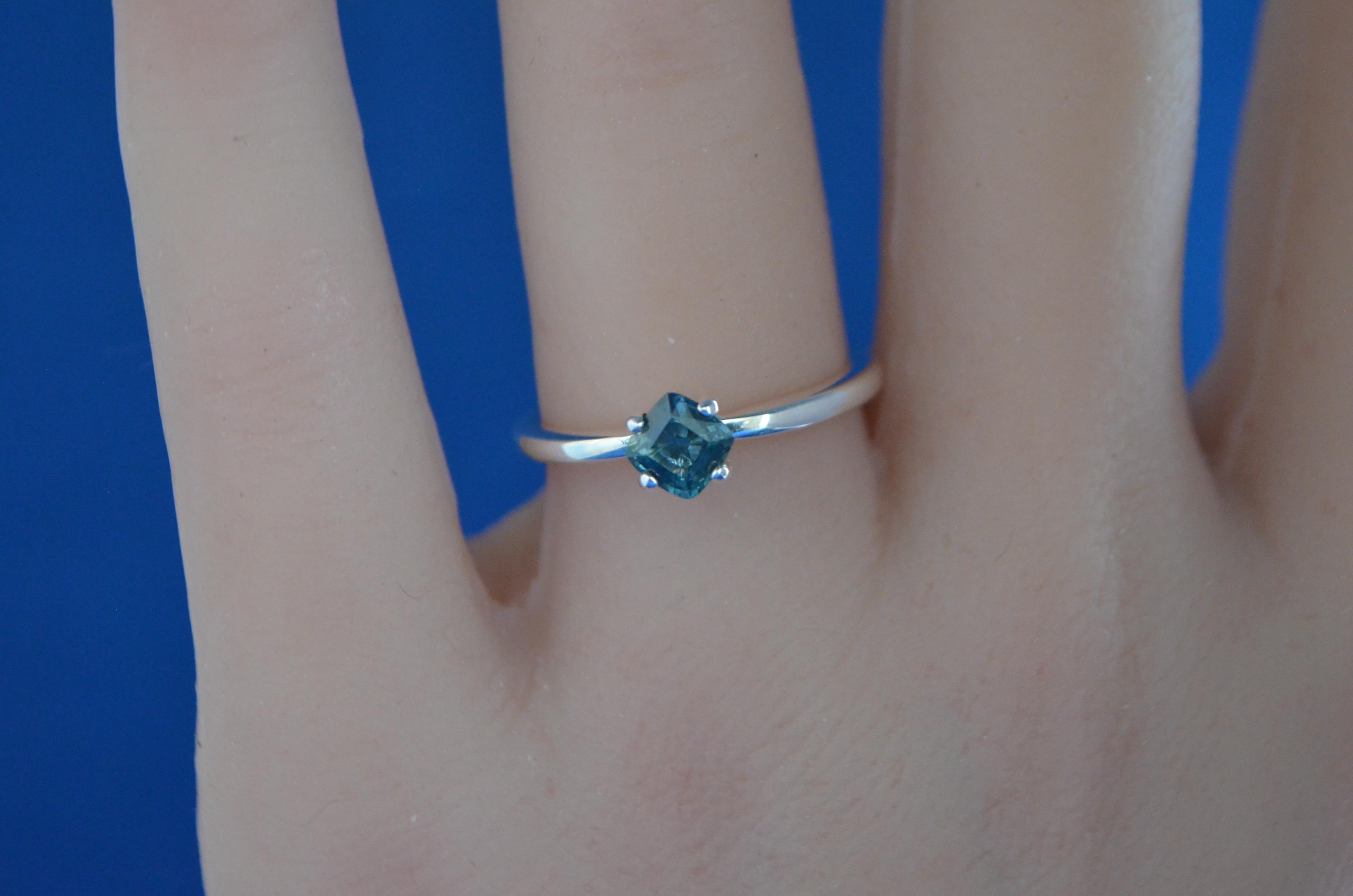 This elegant ring features a genuine multicolor sapphire in a timeless cushion cut, set in a sleek deep vee setting that creates a refined, modern silhouette. The sapphire is natural and earth-mined, weighing 0.74 carats with VVS–VS clarity and displaying beautiful medium blue-green tones that shift subtly with the light. Crafted in solid sterling silver with a polished finish, this ring is a striking choice for an engagement, anniversary, or one-of-a-kind fine jewelry piece. You will receive the exact ring shown.